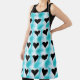 Dieses grafische Design scheint zu leuchten, mit schwarzen Herzen, auf weißen Quadraten auf abstrakten, Schachbrettmuster, türkis, mit blauem Schatten.