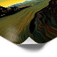 A.I. erschaffene Silhouette einer Hexe mit einem hohen Hut und fließendem Gewand steht in einer Landschaft mit Schloss und malerischen Häusern vor einem Hintergrund von wirbelnden Himmeln und hellen Monden.