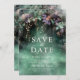 Eine skurrile Aquarellabbilderung üppigen Blattwerks in smaragdgrün mit Lavendel und Lilie, glitzernd mit Feenlampen und zauberhaftem Staub, schmückt die Sommerferien-Hochzeit im Herbst Save the Date mit einem verzauberten Waldthema. Ein elegantes, modernes Save the Date für eine märchenhafte Hochzeit. Ideal für Brautpaare, die die märchenhafte Waldlandschaft, den Märchenwald oder den Märchengarten mit smaragdgrüner Liebe mit einer Touch Lavendel lila.