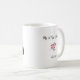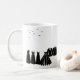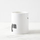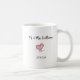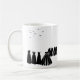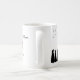 Eine charmante und skurrile Abbildung der Hochzeit durch die Verwendung von Silhouetten der Hochzeitskleidung, die in der Pose eines traditionellen Fotos ausgestellt sind: das Hochzeitskleid, der Bräutigam, der Anzug des Trauzeugen und die Brautkleidung. Die andere Seite der Tasse zeigt den individuellen Namen der Neugeborenen und ihren Hochzeitstermin.