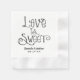 Hochzeitsnapkins bieten "Liebe ist süß" in schwarz handgeschriebenen Schriftzeichen mit einer individuellen Monogrammgestaltung, die den Namen der Braut und des Bräutigams sowie das Hochzeitsdatum beinhaltet.