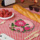 Teller in einem Grenzdruck von Chrysanthemen und Blätter, in Tiefenfuchsien- und Korallenrosa - digitale Kunst auf der Grundlage einer Vintagen japanischen Illustration