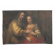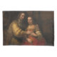 Dieses Design zeigt ein Gemälde des niederländischen Malers Rembrandt Harmenszoon van Rijn aus dem 17. Jahrhundert (1606-1669), der in der Regel als einer der bedeutendsten Künstler in der gesamten Geschichte der Western-Kunst gilt. Das Gemälde soll einem jüdischen Vater zeigen, der an ihrem Hochzeitstag eine Halskette an seiner Tochter schenken soll, obwohl diese Interpretation bestritten. Es könnte einem Mann zeigen, der seiner Ehefrau ein Geschenk macht. Auf jeden Fall zeigt es ein paar, die eine Liebe ausdrücken. Es hätte tatsächlich dazu gedacht sein können, Figuren aus dem Alten Testament zu repräsentieren. Laut Christopher White, der eine Biografie von Rembrandt schrieb, ist das Werk "einer der beststen Ausdrücke der zarten Verschmelzung von spiritueller und physischer Liebe in der Geschichte der Malerei." Das Originalwerk befindet sich derzeit in der permanenten Sammlung des Rijksmuseums Amsterdam.