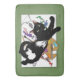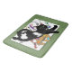 Schwarz-Weiß-Katze, die überall auf dem Papier liegt, mit Farbe, die sich ausbreitet. Stifte, Pinsel und beliebte Spielzeugmaus.