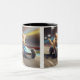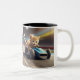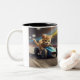 Die Katze fährt ein blaues Rennauto 2024 Zweifarbige Tasse