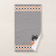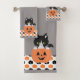 Dieses hübsche Badetuch-Set mit einer schwarz-weißen Katze liegt in einem geschnitzten Kürbis. Unter dem Text befindet sich ein weißes Band mit einem schwarz-orangefarbenen Kürbismuster.