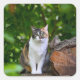 Eine Katze sitzt im grünen Garten neben einem Baumstamm und blickt nach vorn