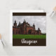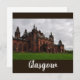Die landschaftliche Flachgrusskarte zeigt ein Foto der Kelvingrove Kunstgalerie und des Museums in Glasgow, Schottland. Weißer Text-Overlay auf braunem Hintergrund