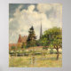 Die Kirche in Eragny. Camille Pissarro. Schöne Landschaft. Dorfkirche mit Spire. Bäume wachsen in der Nähe. Im Vordergrund ist ein Feld. Es ist eine große Wolke am Himmel. Reproduktion berühmter Kunstbilder im öffentlichen Bereich.