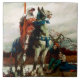 Ein Ritter in Rüstung auf einem Pferd steht neben einem Fluss und hält eine Lanze mit einem nachdenklichen Ausdruck. In der Nähe sitzen zwei Personen auf dem Boden und schauen mit Besorgnis oder Angst auf den Ritter. Dieses Bild heißt "The Coming Lancaster" von Howard Pyle.