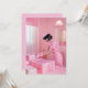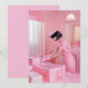 Eine Frau, die von Kopf zu Fuß in sanften rosa, sorgfältig umhüllten Umschlägen gekleidet ist, präsentiert sich in einem perfekt koordinierten rosa Raum. Ihr passendes Outfit, inklusive Handschuhe und Hut, ergänzt die feminine, pastellfarbene Ästhetik des Raumes um einen Vintagen Flair. Die sorgfältig arrangierten Geschenkboxen, die alle mit seidig rosa Bändern geschmückt sind, schaffen eine elegante und präzise Atmosphäre. Die Szene ruft ein Gefühl von Ruhe und Ordnung hervor, mit einem Fokus auf die Schönheit der Einfachheit und Einheitlichkeit in Farbe und Stil.