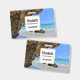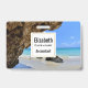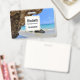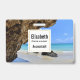 Namensschild mit einem landschaftlichen Naturfoto. Schönes türkisblaues Meer mit einem Sandstrand. Ein großer, brauner Felsen verleiht dem hellblauen Himmel Schatten.