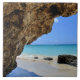 Entworfen mit einem landschaftlichen Naturfoto. Schönes türkisblaues Meer mit einem Sandstrand. Ein großer, brauner Felsen verleiht dem hellblauen Himmel Schatten.
