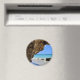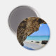 Ein Magnet mit einem landschaftlichen Naturfoto. Schönes türkisblaues Meer mit einem Sandstrand. Ein großer, brauner Felsen verleiht dem hellblauen Himmel Schatten.