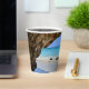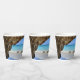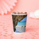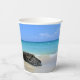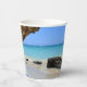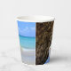 Papiertassen mit einem landschaftlichen Naturfoto. Schönes türkisblaues Meer mit einem Sandstrand. Ein großer, brauner Felsen verleiht dem hellblauen Himmel Schatten.