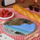 Papier Teller mit einem landschaftlichen Naturfoto. Schönes türkisblaues Meer mit einem Sandstrand. Ein großer, brauner Felsen verleiht dem hellblauen Himmel Schatten.