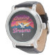 Dieses Design vereint eine lebendige, im Retro-inspiriert Sonnenuntergangsszene. Stilisierte Sonne mit einem markanten Gefälle von tief lila bis feurig orange, Sets hinter einer detailreichen Bergkette. Die Berge sind in tiefer Blues und Schwarz gehalten, mit einer Reihe dunkler Kiefernbäume am Fuß. Der Text "Jagd" und "Träume" umrahmt das Bild in einem kühlen Retro-Schriftart mit einem hellrosa und blauen Farbschema, das ein Gefühl von Abenteuer und Optimismus weckt. Es ist eine perfekte Mischung aus Naturschönheit und Retro-Ästhetik, ideal für diejenigen, die Liebe Reisen, Natur und Vintage Kunststile.