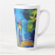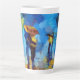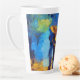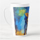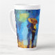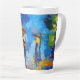 Diese Tasse ist mit einem Handgemälde eines Ehepaares versehen, das einen Regenschirm trägt, während die Regentropfen fallen. Der Hintergrund besteht aus einer farbenfrohen künstlerischen Landschaft.