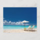 Liegestühle am Strand. Helle Sonne, blauer Himmel, türkisfarbenes Wasser, weißer Sand und Ruhe - schöne Ferien