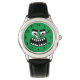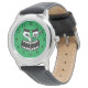 Die lustige Kinderuhr mit grünem Monster gegenüber Armbanduhr