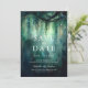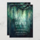 Eine skurrile Aquarellabbilderung üppigen Blattwerks in smaragdgrünem Blau, glitzernd mit Märchenleuchten und zauberhaftem Staub, schmückt diese Sommer-Hochzeit im Herbst Save the Date mit einem verzauberten Waldthema. Ein elegantes, modernes Save the Date für eine märchenhafte Hochzeit. Ideal für Brautpaare, die die märchenhafte Waldlandschaft, den Märchenwald oder den Märchengarten mit smaragdgrünen Lieben.