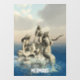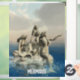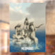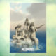 Drei Meerjungstatuen auf einem Felsen im Meer. Mermaids Text kann von Ihnen angepasst werden.
