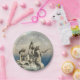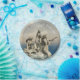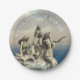 Drei Meerjungstatuen auf einem Felsen im Meer. Schöne Sirenen der Sieben Meere Text kann von Ihnen angepasst werden.