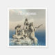 Drei Meerjungstatuen auf einem Felsen im Meer. Stilvolle Memadin-Texte können von Ihnen angepasst werden.
