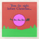 "Das war die Nacht vor Weihnachten" steht über einer Darstellung des Schlitten und Rentiers des Weihnachtsmannes. Drei Rentiere sind umkreist, was die Illusion schafft, dass der Schlitten des Weihnachtsmannes nach einem Vollmond fliegt. Der Kreis weist eine rote Kontur mit einem rosa/hellen lila Innern auf. Unten erstreckt sich eine grüne Landschaft mit Bäumen über das Design, Set vor einem roten Hintergrund. Die typischen Weihnachtsfarben Rot und Grün dominieren, der Text ist in einer tiefen Marinehöhe.