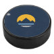 Hockey Puck mit der neuen Fahne der Stadt Reno, Nevada; eine dunkelblaue Fahne mit gelber Sonne und blauen Bergen in der Mitte