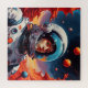 Ein einsamer Astronaut steht auf einer felsigen Landschaft der Alien und blickt auf eine massive Roboterstruktur mit einer klaren Kuppel und mechanischen Beinen. Mehrere Planeten sind am Himmel sichtbar, was eine beeindruckende Szene der Weltraumforschung schafft.
