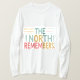 Dieses kühne T - Shirt-Design zeichnet sich durch den Ausdruck "The North Remembers" in einem lebendigen, vielfarbigen Farbverlauf aus. Die Farben fließen nahtlos von feurig orange zu eisblau und erinnern an die blendende Orora borealis.