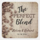 Einzigartige Kaffeeaufkleber mit Kaffeebohnen auf rustikalem Holzfußboden.Sie sind genau das Richtige für die perfekte Mischung von Kaffeegenüssen für Ihre Gäste. Personalisieren Sie mit Braut- und Bräutigamen, Hochzeitsdatum und Dankeschön Nachricht.