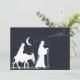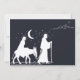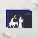 Eine weiße und blaue Weihnachtseinladung, die Maria und Joseph auf ihrer Reise nach Bethlehem zeigt, die in der Ferne sichtbar ist.