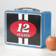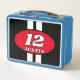 Autorennen Nummer gestalten eigens für Kinder maßgeschneiderte Metal Lunch Box. Racing Streifen Design mit ovalem Zahlenlogo. Personalisierte Textvorlage und Hintergrundfarben. Fügen Sie Ihre eigene Make-Year oder Rennnummer hinzu. Große, fette Buchstabentypografie mit sportlich gestreiften Linien. Autogeschenk für Kinder.