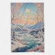 Überraschenderweise: Eis friert nicht immer fest! Kleine Luftblasen und Verunreinigungen können atemberaubende Muster und Texturen innerhalb der gefrorenen Oberfläche erzeugen. Dieses ruhige Design vereint die friedliche Schönheit einer Winterlandschaft mit einem ruhigen See, umgeben von schneebedeckten Bäumen und majestätischen Bergen. Die untergehende Sonne strahlt ein warmes Licht über die Szene und schafft so eine atemberaubende Aussicht, die ein Gefühl der Ruhe und des Staunens weckt. Ideal, um jedem Projekt eine Touch Wintermagie hinzuzufügen.