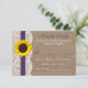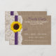 Die rustikale Sonnenblumenkollektion ist ein atemberaubendes Design mit einem hübschen rustikalen Burleffekt-Hintergrund und einem romantischen Vintagen Spitzeneffekt, der mit einer atemberaubenden Sonnenblume und einem lila Band vollendet wird. Diese RSVP Karten können für Ihren besondere Anlass personalisiert sein und würden die passenden Beilagen für jede rustikale Hochzeit, Brautparty, Verlobungsfeier, Geburtstagsparty und vieles mehr machen. *Bitte beachten Sie, dass Zazzle nur gedruckte Einladungen verkauft, sodass diese Einladungen keine echten Einladungen, Spitzen, Sonnenblumen oder Bandmaterialien enthalten.