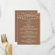Die schlichte und elegante Saitenleuchte der rustikalen Kraft Hochzeitskollektion ist ein atemberaubendes Design mit hübschen, weißen Hängeleuchten auf einem Kraft-Effekt-Hintergrund, der sich perfekt für jede rustikale Hochzeitsfeier eignet. Diese Menükarten können für Ihren besondere Anlass personalisiert sein und würden das perfekte Menü für Ihre Hochzeit, Brautparty, Verlobung Party, Geburtstagsparty und viele andere besondere Anlässe machen. Fügen Sie diesem Design Ihre benutzerdefinierte Formulierung hinzu, indem Sie die "Diese Vorlage bearbeiten"-Felder auf der rechten Seite des Elements verwenden, oder klicken Sie auf die blaue Schaltfläche "Anpassen", um den Text anzuordnen, die Schriftart und Farben zu ändern und um diesem Design zusätzliche Informationen oder Bilder hinzuzufügen. ÜBERPRÜFEN SIE DIE ENTSPRECHENDEN ELEMENTE FÜR DIESE ERHEBUNG