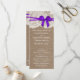 Die rustikale lila Bogen-Hochzeitskollektion ist ein atemberaubendes Design mit einem hübschen rustikalen Burlap-Effekt-Hintergrund mit einem romantischen Vintagen, weißen Spitzeneffekt und einem atemberaubenden lila Bogen. Diese Programme können für Ihren besondere Anlass personalisiert sein und würden die perfekte Vorlage für Hochzeiten, Brautpartys, Verlobungsfeiern, Geburtstagsfeiern und vieles mehr machen. *Bitte beachten Sie, dass Zazzle nur gedruckte Produkte verkauft, sodass dieses Produkt keine echten Bruch-, Spitzen- oder Bänder-/Bogen-Materialien aufweist.