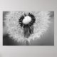 Schwarz-Weiß-Foto von Dandelion Samen nah. Einige Samen sind bereits weggeblasen, während die übrigen Samen einen Kreis auf dem weißen Button Kissen einer Blume bilden.