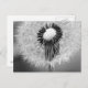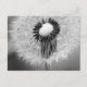 Eine nahe hohe Schwarzweiss-Fotografie der Löwenzahnsamen. Einige Samen haben bereits weg durchgebrannt, während die restlichen Samen einen Kreis auf dem weißen Buttonkissen eines Blumenkopfes schaffen.