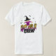 Eine Strohkopfschwache, die einen schwarzen Hexenhut trägt, wird von fliegenden Krähen betont und kündigt an, dass Sie Teil der Crew "The Scare" sind. Dieses Design funktioniert sowohl für ein Halloweenkostüm von Kindern als auch für Erwachsene. Die mutige Typografie hat eine goldene und lila Farbpalette. Suchen Sie ID1002 um weitere Produkte mit diesem beängstigenden Halloween-Design zu sehen.