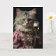 Eine bezaubernde Katze, die in den jeden Anlässen einen Champagner-Rohling hält, der die Karte begrüßt