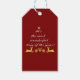 Elegantes Design mit "Es ist die schönste Zeit des Jahres" Drehbuch in einer Kiefernform mit goldenen Sternen, goldenen Hirschen und goldenen Geschenken. Verwenden Sie das Tool Anpassen, um die Hintergrundfarbe oder die Größe des Skripts zu ändern.