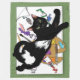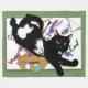 Eine Schwarz-Weiß-Katze liegt mit ihrer Lieblingsmaus auf Leinwand-Papier vor einer grünen Kulisse über Papier, Farbe, Palette, Färbung und Bleistifte