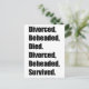 Der klassische Reim, der Geschichtsliebhabern auf der ganzen Welt hilft, erinnern sich an die Geschehnisse der sechs Ehefrauen von Henry VIII (Henry der Achte Englands). Geschieden (Catherine von Aragon), Beheaded (Anne Boleyn), tot (Jane Seymour), geschieden (Anne of Cleves), Beheaded (Katherine Howard), überlebt (Katherine Parr).