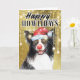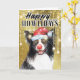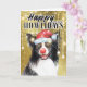 Eine lustige und niedliche Aquarellillustrierung einer schwarz-weißen Randfarbe, die eine rote Weihnachtsmannmütze trägt, die mit Imitaten aus weißem Fell mit Drahtgitter und einer roten Rentiernase gesäumt ist. Er ist in Weihnachtsbaumleuchten verstrickt und von langen vertikalen Streichellichtern und einem Imitat gerahmt, das den goldenen Glitzer-Hintergrund ausstrahlt. Ideal für Geschäftsjahreswünsche an Kunden oder als bezaubernde Urlaubskarte für Freunde und Familie.