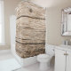 Die Struktur eines alten Holzbügels ohne Rinde mit Duschvorhang