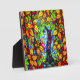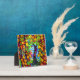 Die farbenfrohe Tischkunst, die mit AI-Software kreiert wurde, bietet einen surrealen Apfelbaum aus Buntglas mit grünen und goldenen Blätter und roten Äpfeln, die ebenfalls einen Rahmen schaffen.