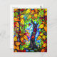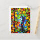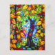 Die farbenfrohe Postkarte der Digitalkunst, die mit AI-Software erstellt wurde, enthält einen surrealen Apfelbaum aus Buntglas mit grünen und goldenen Blätter und roten Äpfeln, die ebenfalls einen Rahmen bilden.
